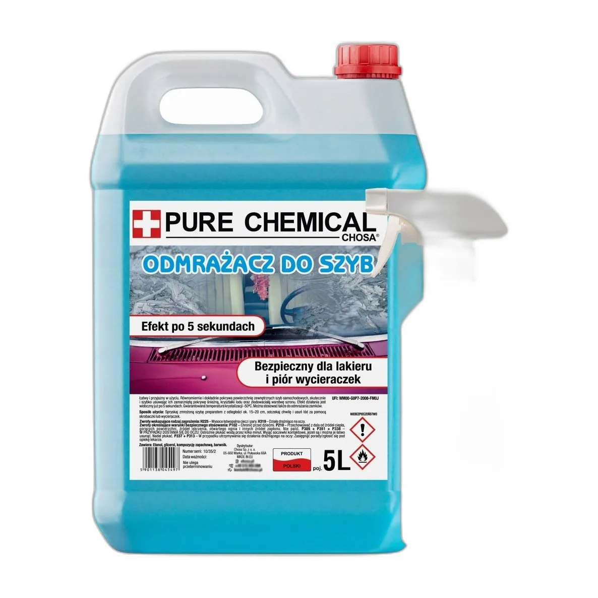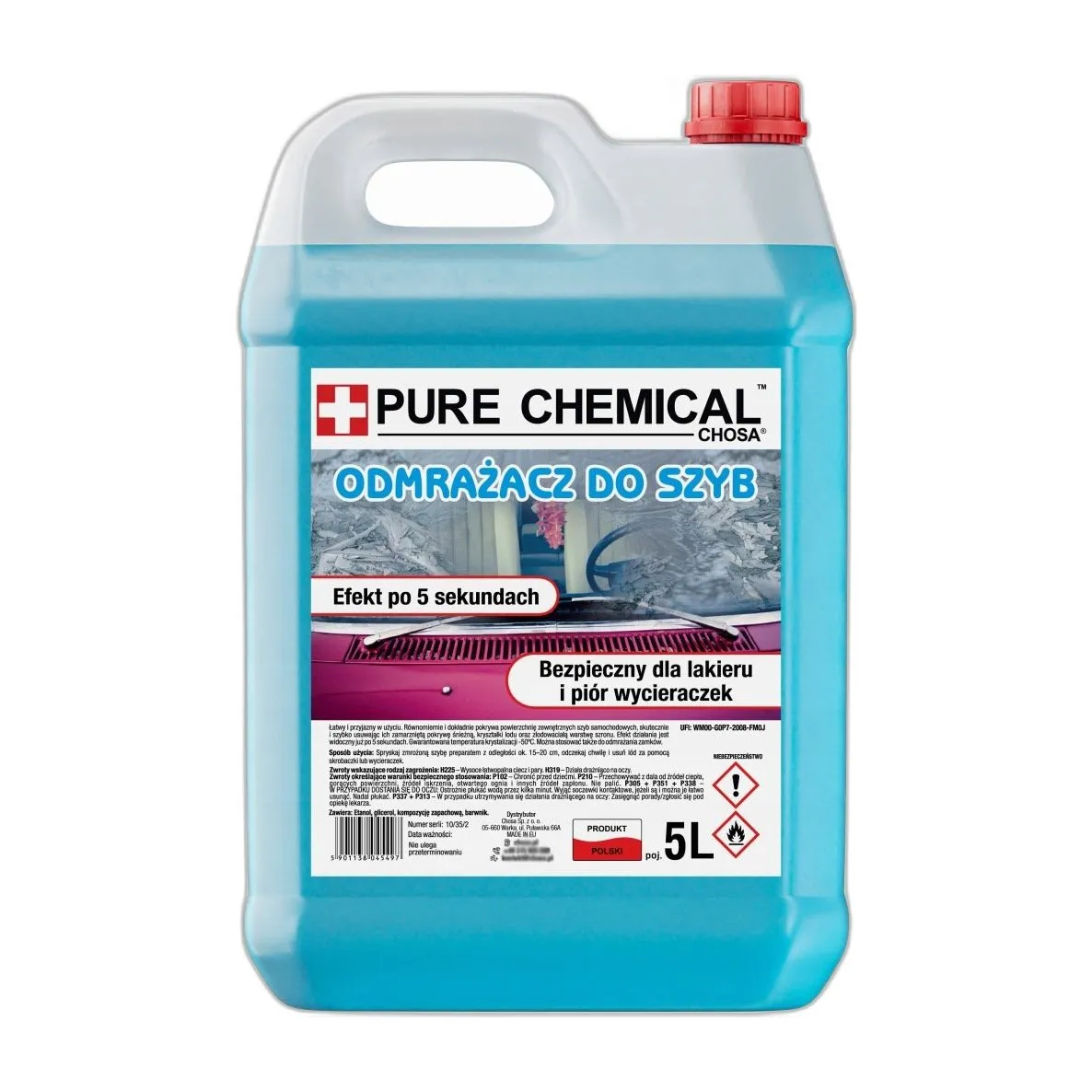 Pojemność: 5000 ml. Opakowanie polietylenowe HDPE. Przechowywać w miejscu suchym, z dala od światła i źródeł zapłonu. Temperatura przechowywania: od -40°C do +30°C. Produkt łatwopalny — należy unikać kontaktu z ogniem. Nie mieszać z silnymi utleniaczami.