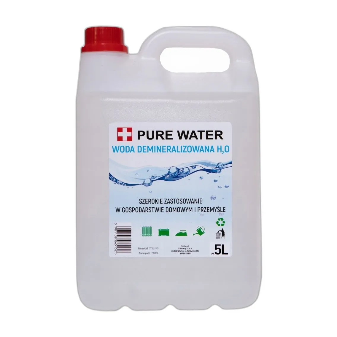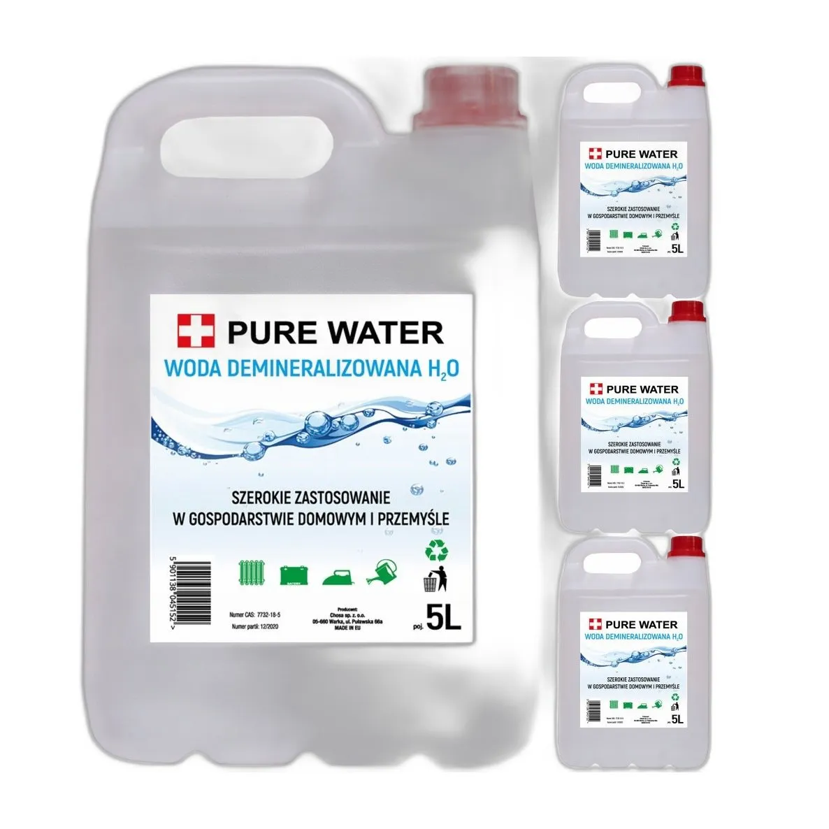 Pakiet zawiera 4 butelki po 5 litrów (łącznie 20 L). Objętość: 20 l. Opakowanie: plastikowe butelki HDPE z zatyczkami. Przechowywać w suchym miejscu, w temperaturze od +5°C do +25°C, z dala od substancji chemicznych o silnych zapachach. Nie wymaga specjalnych warunków magazynowania. Przewodność elektryczna ≤ 5 µS/cm, pH 5.5–7.0 (w 25°C).